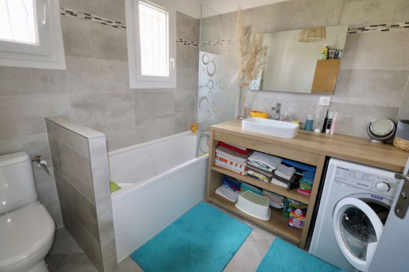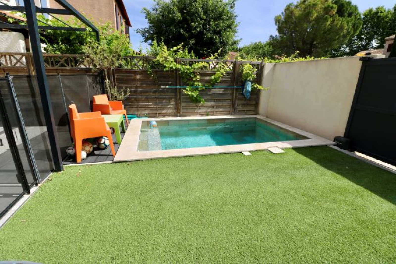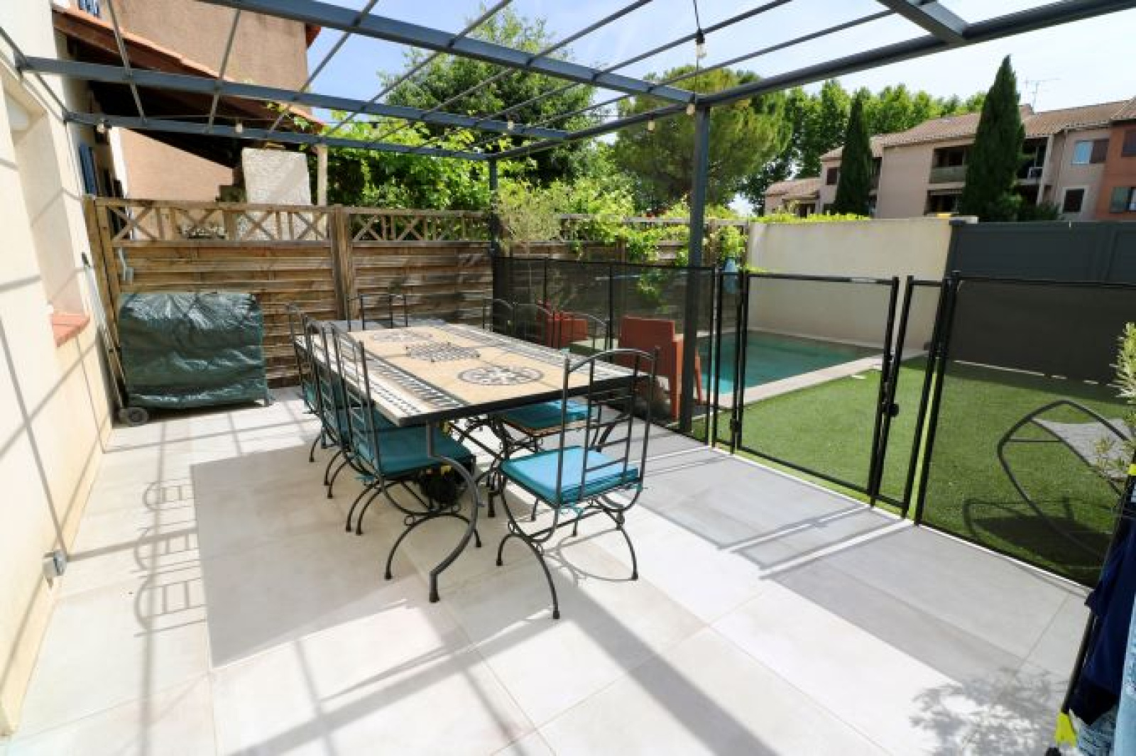 Cette maison T4 d'env 94 m² entièrement rénovée et décorée au goût du jour, a vendre dans le village d'Aix - Les Milles, est située dans un lotissement, à proximité des commerces et écoles à pied. Elle se compose au rez de chaussée d'une véranda, d'un hall d'entrée avec rangements, d'une cuisine équipée ouverte sur le séjour de 41 m² donnant sur la terrasse avec tonnelle et bassin (piscine) et d'un WC indépendant. A l'étage, 3 chambres avec placards, une salle de bains avec le coin machine à laver et WC.