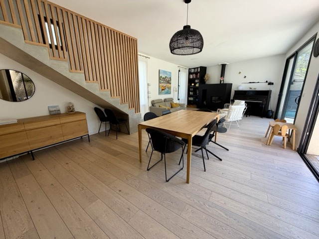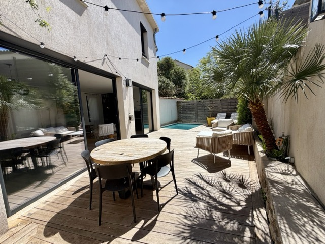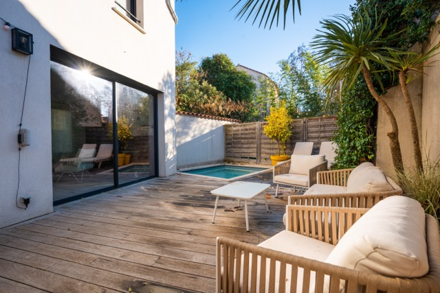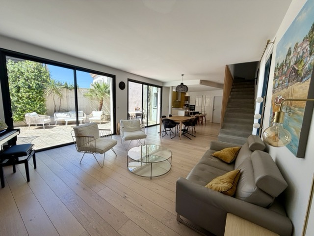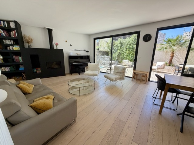 Terrain de 168 m² avec un petit bassin et de belles terrasses plein sud. Un garage 2 voitures complète ce bien. Rénovation faite avec beaucoup de goût et prestations de qualité : baies aluminium, volets électriques centralisés, domotique, placards sur mesure, parquet chêne massif, escalier béton, salle de bains en béton ciré... CLASSE ENERGIE : A et CLASSE CLIMAT : A. Mandat 2021482CF. FAI. Honoraires à la charge de l’acquéreur 4,07%.