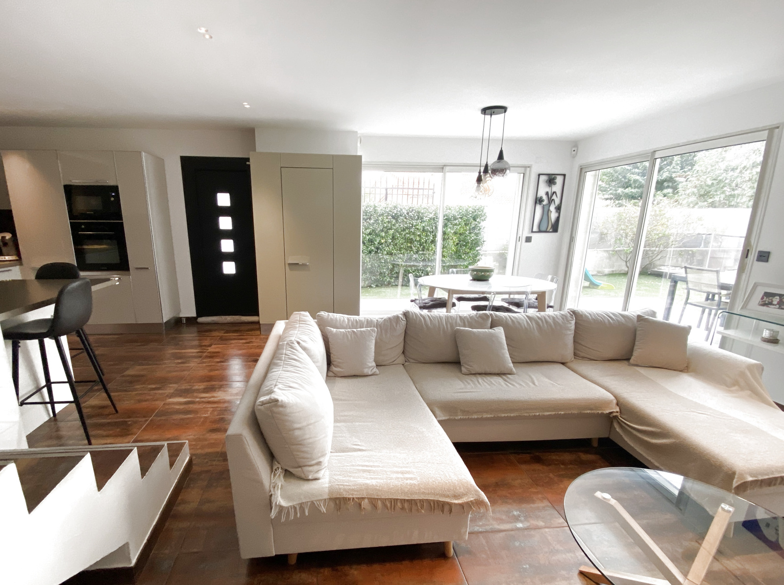 - au rez de chaussée : d'un séjour donnant sur la terrasse et le jardin, d'une cuisine ouverte équipée et d'une buanderie,